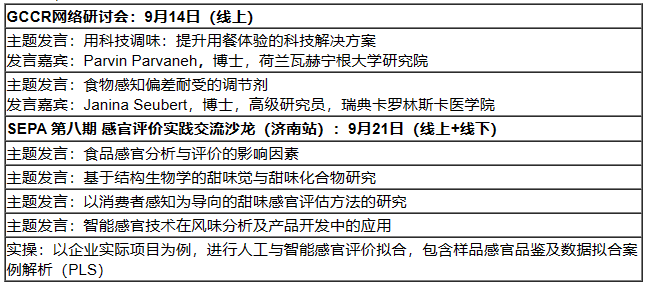 9月14日,GCCR網(wǎng)絡(luò)研討會邀請到來自瑞典卡羅林斯卡醫(yī)學(xué)院和荷蘭瓦赫寧根大學(xué)的年輕學(xué)者做線上學(xué)術(shù)報(bào)告。9月21日,SEPA 第八期感官評價實(shí)踐交流沙龍?jiān)谥袊?middot;山東·濟(jì)南線下邀請食品行業(yè)感官專家進(jìn)行相關(guān)經(jīng)驗(yàn)分享交流,同步線上直播。