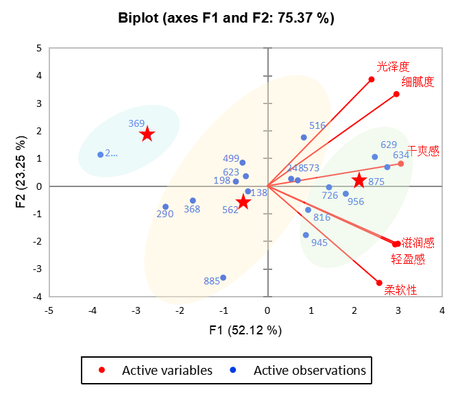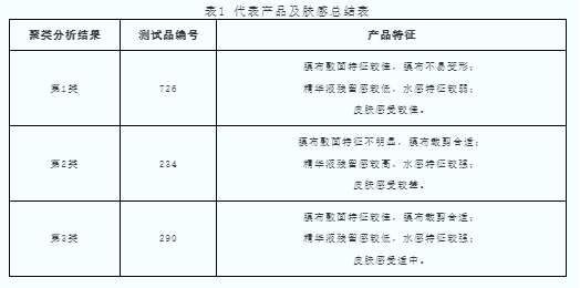 (1)通過感官QDA測試,結合主成分分析與聚類分析,定位該類面膜的主要感官屬性,總結3類面膜的膚感特征,選出每一類的代表品;