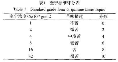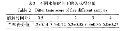 本文首先對大豆肽的苦味特性進行人工感官評價,然后冉研究電子舌儀器進行感官分析。本實驗從對苦味敏感的專業人員中選取10位感官評價員(5男5女)進行感官評價,每次品嘗之后,需要用清水漱口,再進行下一次品嘗。最后,將與其口味接近的奎寧標準液濃度對應的分值記為此溶液的得分。之后取10位評價人員的平均分為苦味評定分數。以奎寧的作為評分標準,評分標準見表1。表2為風味蛋白酶不同水解時問下的苦味得分值。