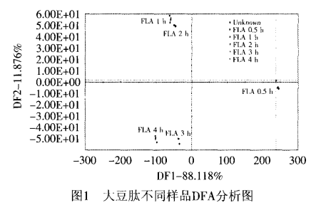 采用法國AlphaMOS電子舌對制取的五種不同酶解時間條件下的樣品進行苦味特性研究。分別采用DFA模式識別方法和PLS預測模型對采集的數據進行定性和定量分析,研究表明:采用DFA分析法能夠對五種不同的大豆肽樣品的呈味特性和味覺相似程度進行定性評價,PLS模型能對未知樣品進行呈味預測;大豆肽的苦味預測結果與實際感官評價吻合。研究結果為后續大豆肽產品的呈味特性研究提供一種新的方法途徑。
