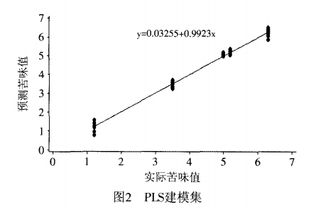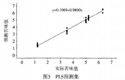 用PLS建立大豆肽溶液電子舌苦味預測模型,并對電子舌傳感器響應值與人工感官評價得分值問的相關性進行研究。以七根傳感器的響應信號值為白變量,以感官得分值為因變量構建偏最小二乘模型。建模集為60個樣本,驗證集為30個樣本。結果如圖2、圖3所示,分別表示建模集、預測集的實際苦味值與預測值的相關圖。