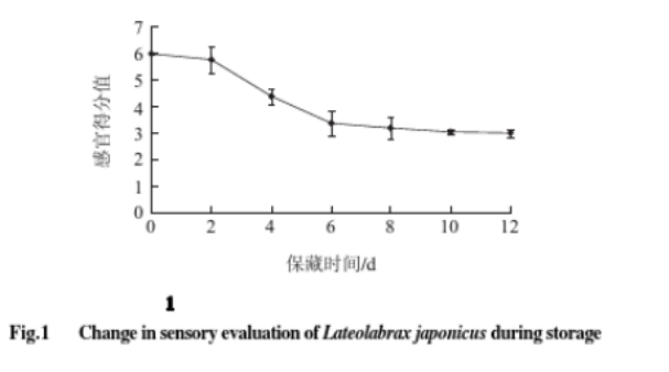 如上圖,保藏初期鱸魚新鮮無異味、鰓絲鮮紅清晰、體色鮮艷有光澤,肌肉僵硬良好;第4天鱸魚眼角膜稍有混濁,鰓色部分變暗紅,魚體開始變軟,與前2d相比質量下降明顯,感官的分值為4.4;第6天眼球平坦,眼角膜較渾濁,鰓大部分變暗紅色,略有腥臭味,魚體色澤較暗,肌肉彈性較差,第8天鰓全部變為暗紅色且有黏液,魚體無光澤,鱗片無脫落。感官的分值為3.2;第10天魚體腥臭味變大,肌肉變軟,手指按壓后彈性不易消失;第12天眼球平坦,鰓色變褐,腥臭味大,感官得分值為3.0。