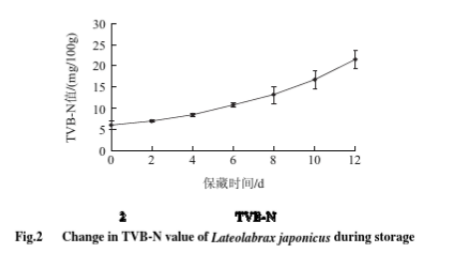 由上圖可知,保藏前4d TVB-N值上升比較緩慢,第4天開始上升加速,說明鱸魚品質從第4天開始下滑較快;而由圖一感官得分的變化可知,從第2天開始鱸魚感官品質明顯下降,說明在保藏初期鱸魚感官變化比TVB-N的變化更靈敏。第12天鱸魚的TVB-N值為21.6mg/100g,整個保藏過程中TVB-N值均為超過GB/T 18108-2008三級標準的要求(小于30mg/100g)。