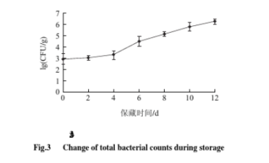 圖三表明,保藏出去菌落總數變化較小,出現明顯的延滯期,這是由于鱸魚中的微生物剛進入冷環境,在0℃條件下生長緩慢。第6天菌落總數較第4天顯著增長,保藏后期總數繼續遞增,在貨架期終點時最大。菌落總數的變化趨勢與TVB-N值檢測結果基本一致。