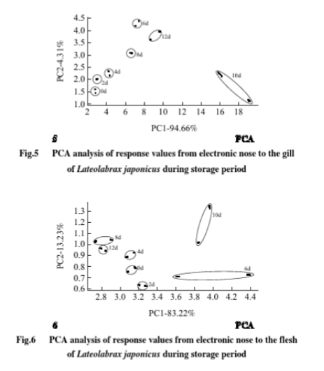 通過對鱸魚進行感官評定、TVB-N和菌落總數分析,發現運用PCA分析電子鼻檢測結果與TVB-N值和菌落總數變化相應,證實了電子鼻檢測鱸魚新鮮度的可行性。