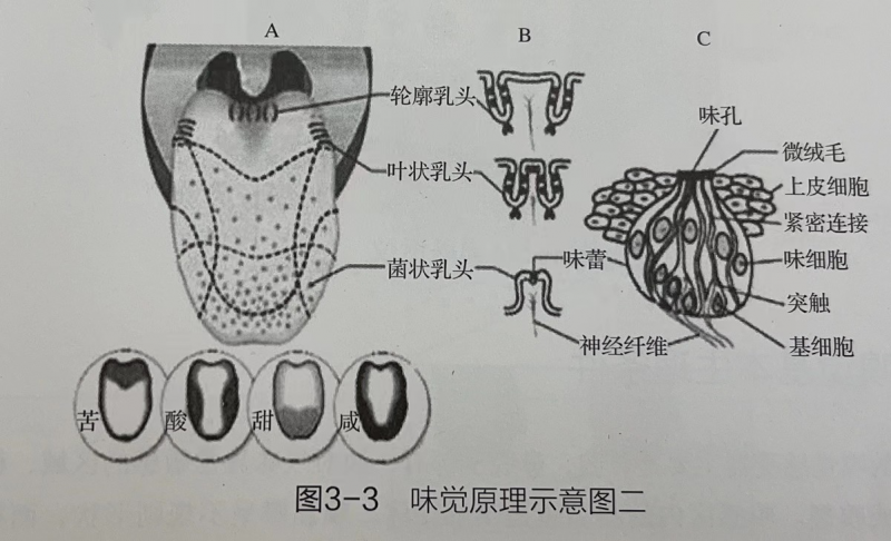 人的味覺感受器官主要是舌。舌面上分布有乳頭,其中菌狀乳頭多位于舌尖與舌緣,散布于絲狀乳頭之間,呈磨菇狀,含有味蕾(圖3-3)。
