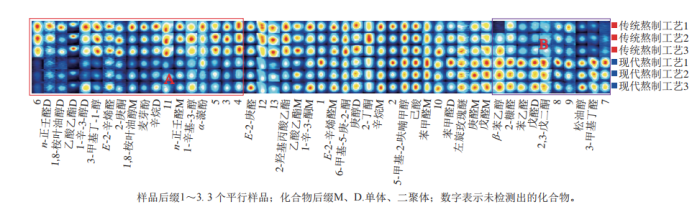 兩種“佛跳墻”樣品的特征揮發(fā)性組分具有各不相同的GC-IMS特征譜信息。傳統(tǒng)熬制工藝下佛跳墻部分揮發(fā)性有機(jī)物濃度高于現(xiàn)代熬制工藝。
