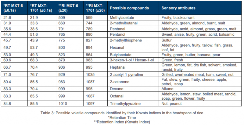比較其己醛的含量可知大米的氧化水平,比較2-乙酰基-1-吡咯啉含量可知其特征香味在大米中的含量。