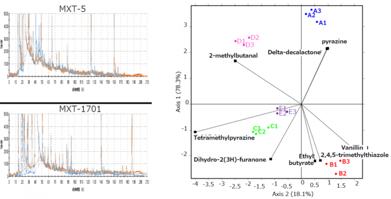 通過TDS持續(xù)時間生成的主成分分析圖:A,B,C,D,E 這幾個樣品都有不同的感官特征,比如A產(chǎn)品的榛子味濃一些,C產(chǎn)品的烤可可味更濃一些。