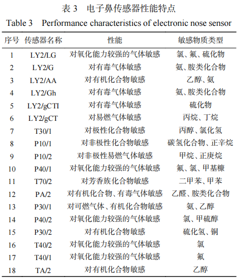 電子鼻分析 法國產電子鼻是通過MXT-5(弱極性)和MXT-7(中極性)色譜柱分離氣味物質,一共由18根金屬氧化傳感器組成,每根傳感器對應一類或幾類物質敏感,采用氫離子檢測器分析色譜信息,完成檢測后,即可使用儀器自帶數據庫對樣品揮發性物質進行定性、定量分析。電子鼻傳感器性能特點見表3。