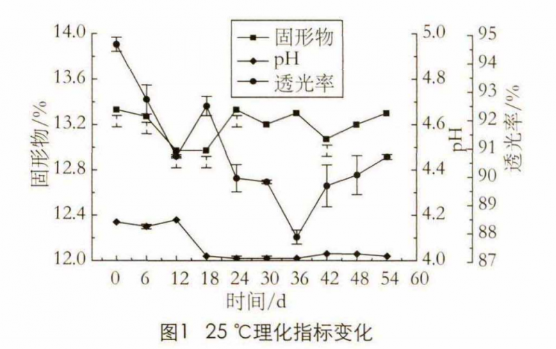 本文采用溫度作為加速實(shí)驗(yàn)的變量條件,設(shè)置溫度25、35、45 °C 。不同溫度下電子鼻、電子舌及理化指標(biāo)檢測(cè)的時(shí)間間隔不同,其中:25 °C下分別于0、6、12、18、24 .. ...42、48 、54 d 測(cè) 定 ,即每隔 6 d 檢測(cè);35 °C 下分別于 0 、4、8 、 12、16 .....28、32 d 測(cè)定,即每隔4 d檢測(cè);45 °C下分別于 0、4 、6 、8 .. ...14、 16 d測(cè)定。