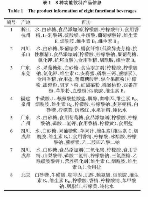 8 種功能飲料均為市售,其編號、品牌、廠家、產地及配方見表1。