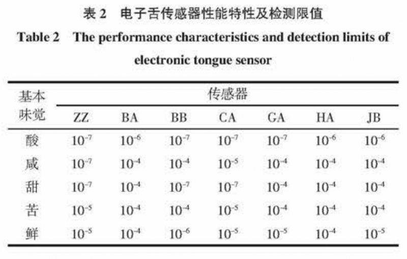 儀器:ASTREE型電子舌,法國 AlphaMOS公司,該電子舌由 7 根非專一性和一個Ag/AgCl參比電極組成,每根傳感器對酸、甜、苦和鮮味敏感程度不一樣,其傳感器特性及檢測限值見表 2。