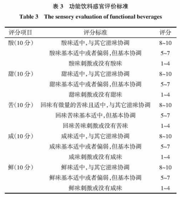 功能飲料在酸味上差異最大,其是咸味,最后是甜、苦、鮮味,這與電子舌測定結 果基本一致。綜上所述,市售功能飲料滋味差異主要表現為酸、甜、咸味不同,可能是因為飲料中酸味 (檸檬酸、冰醋酸等)、甜味( 主要為白砂糖)、咸味物質的種類及含量不同所致。