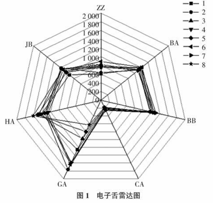 電子舌是一種模仿生物嗅覺器官的設備,通過膜材料電勢變化產生的響應值來反映樣品滋味變化。8 種市售功能飲料在電子舌上產生的響應值如圖1所示。