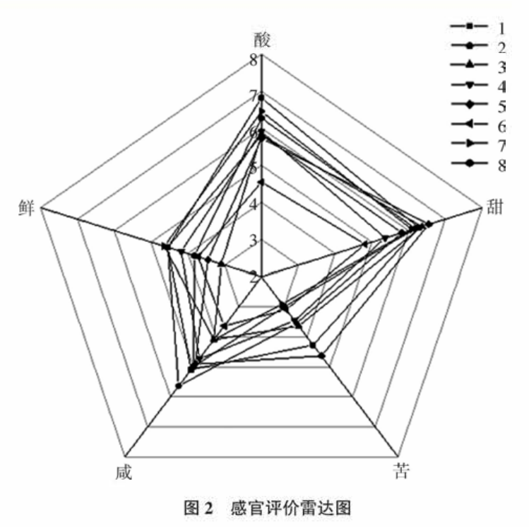 在本研究中,感官評價及電子舌對 6、7、8 號樣品的分組存在差異,并且電子舌不存在與酸味品質顯著相關的探頭。針對上述問題,可能原因是:1相對于電子舌,感官評價受環境及人為因素影響較大,其結果存在較大的波動;2 食品中滋味的形成不僅與呈味物質種類(氨基酸、多肽類、核苷酸、還原糖等)有關,還受呈味機制(相乘作用、遮蔽作用、消殺作用等)的影響。試驗采用非專一性的電子舌探頭,該類探頭是根據呈味物質建立的模型來預測樣品滋味相對強度,但對于單一滋味,其預測效果可能不太理想,使探頭與某些重要的滋味品質的相關性不顯著。