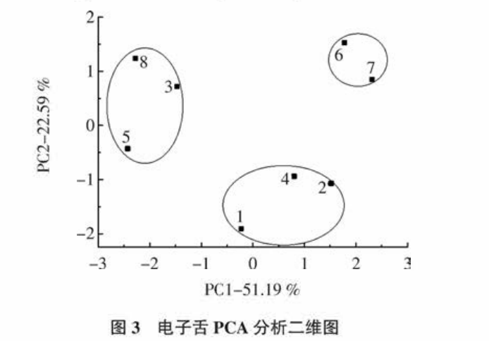 主分分析是一種把多個指標通過降維轉化為幾個綜合指標的方法。8 種功能飲料的電子舌主分分析二維圖見圖 3。