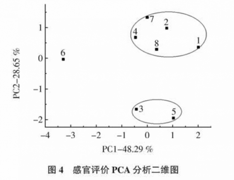 主成分 1、2的貢獻度分別為 51.19 % 、22.59 % ,累計方差貢獻度為 73.78 % , 兩個主成分包含了樣品的大部分信息,從二維圖上看,8 個樣品可分為3類:1、2、4為第一組;3、5、8為第二組;6、7為第三組。8 種功能飲料的感官評價的主分分析二維圖見圖 4。