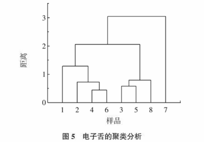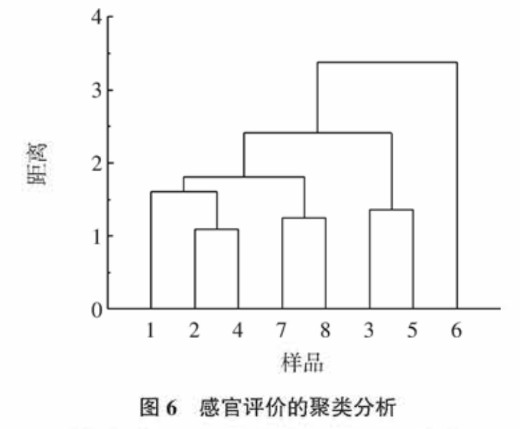 由圖5 和圖 6 可知:若以電子舌指標為參考,當距離為 1.28 時 ,可將 8 種能飲料分 為 3 類,分組情況如 1、2、4、6為第一組,3、5、8為第二組,7 為第三組,這與主成分分析結果基本一致,僅 6 號樣品分組情況無法確定。若以感官指標為參考,距離為 2 時,可將8 種功能飲料分為3類,分組情如下:1、2、4、7、8 為第一組,3、5為第二組,6 為第三組,這與感官評價主成分分析結果一致。綜上所述 ,采用聚類分析,8 種功能飲料按電子舌與感官評價差異可獲得較為一致的分組 :1、2、4為 第一組,3、5為第二組,但 6 、7、8號樣品分組情況有差異。