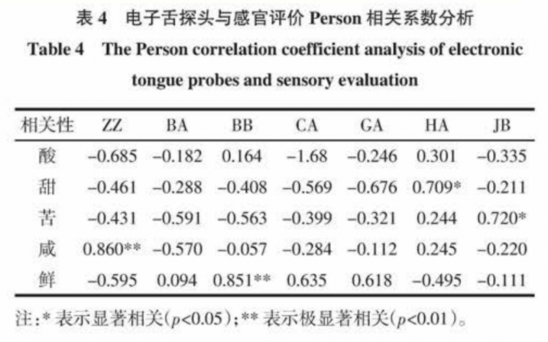 通過對 8 種能飲料的感官與電子舌進行主成分與聚類分析,試驗發現感官與電子舌測定可對大部分樣品(1、2、3、4、5號)進行分組,但部分樣品 ( 6、7、8號 )分組存在差異。為進一步探究導致這種差異的原因,試驗對感官評價與電子舌七個探頭進行Person相管系數分析,結果見表 4。