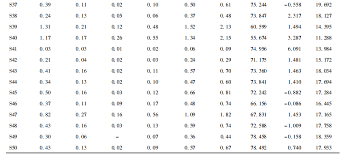 取穿心蓮藥材共50批,使用高效液相色譜儀測定,計算穿心蓮中各指標成分的含量,見表3。結果發現收集部位為莖的4個成分總和的質量分數處于0.09%~0.81%;收集部位為地上部分的4個成分總和的質量分數處于0.74%~3.48%;收集部位為葉的4個成分總和的質量分數處于1.66%~3.69%。