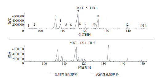 花椒:取0.2g花椒顆粒于20mL頂空進(jìn)樣瓶中,迅速加蓋密封檢測(cè),設(shè)置3個(gè)平行樣品,降低檢測(cè)誤差。