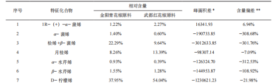 表1 武都紅花椒、金陽(yáng)青花椒原料特征化合物相對(duì)含量與峰面積差異