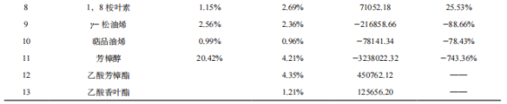 青花椒精油中共分析出11種含量較高成分,紅花椒精油中共分析出13種含量較高成分,乙酸芳樟酯與乙酸香葉酯在青花椒中未曾檢測(cè)出,與原料表現(xiàn)一致。