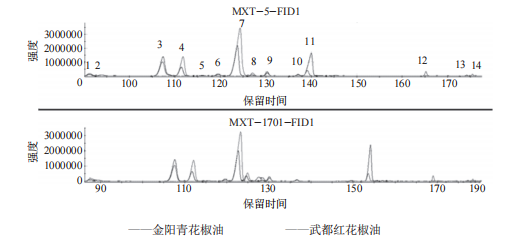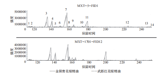 圖2 武都紅花椒精油、金陽(yáng)青花椒精油指紋圖譜