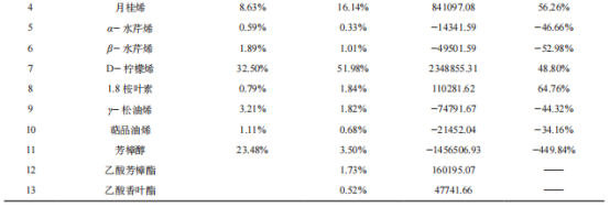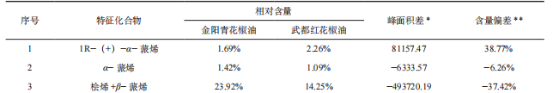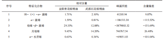 表2 武都紅花椒精油、金陽(yáng)青花椒精油特征化合物相對(duì)含量與峰面積差異