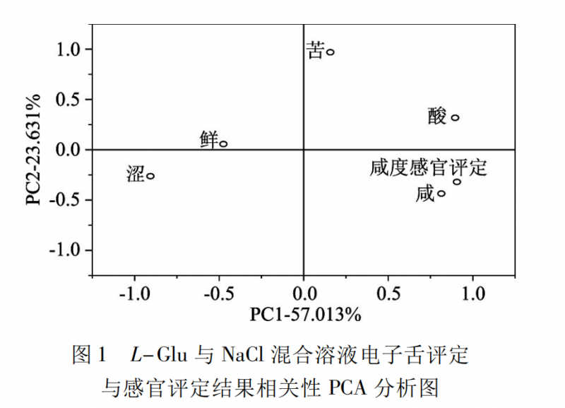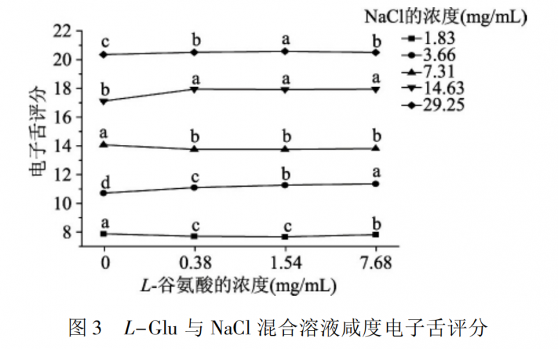 低濃度氯化鈉水平下,谷氨酸對其咸度有抑制效果,但在 3.66 mg /mL 氯化鈉水平下,谷氨酸對其咸度卻有增強作用,而在高濃度氯化鈉水平下,谷氨酸對其咸度有增強作用。谷氨酸對氯化鈉咸度的作用效果受物質濃度的影響,研究發現低濃度的谷氨酸鈉對氯化鈉咸度無影響,高濃度的谷氨酸鈉則對氯化鈉的咸度有增強作用。將 L-谷氨酸與氯化鈉混合溶液咸度的感官評定結果和電子舌評定結果進行相關性分析,發現其相 關 性 系 數 r = 0.993 ( p <0.01) 。