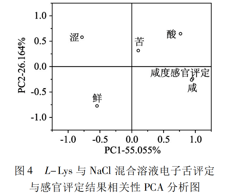 對L-Lys 與 NaCl 混合溶液的感官咸度評分和電子舌所測得的咸、酸、苦、澀、鮮五組數據進行主成分分析,如圖 4 所示,PC1 和 PC2 累積方差貢獻率為81.219%,“感官咸度評分”和電子舌數據“咸”在圖上位 置 重 合,而與電子舌其他數 據“酸”、“苦”、“澀”、“鮮”距離很遠,說明電子舌對溶液咸度的評分“咸”與感官咸度評分相關性較高。