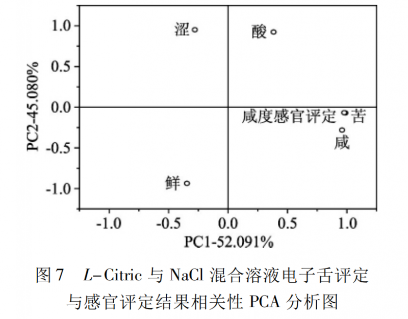 對L-Citric與 NaCl 混合溶液的感官咸度評分和電子舌所測得的咸、酸、苦、澀、鮮五組數據進行主成分分析。如圖 7 所 示,PC1 和 PC2 累積方差貢獻率為97.981%,“感官咸度評分”和電子舌數據“咸”在圖上位置相近,說明電子舌對溶液咸度的評分“咸”與感官咸度評分相關性較高。在 PCA 分析圖上,“感官咸度評分”除了與電子舌數據“咸”在圖上位置相近之外,還與電子舌數據“苦”有著非常近的距離。文中主要研究的是兩種方式對溶液咸度的評定,而沒有將苦味的感官評定和電子舌評定進行比較。在L-Citric與 NaCl 混合溶液味道的電子舌評定中,“苦”味可能受到其他味道的干擾而判斷有誤,導致其在 PCA 圖上與“感官咸度評分”相距很近,但不影響對“感官咸度評分”和“咸”之間相關性的分析。