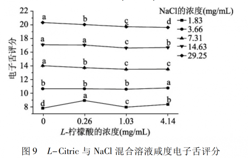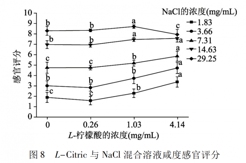 圖8 是 L-Citric 與 NaCl 混合溶液咸度的感官評定結果。在相同的氯化鈉濃度水平下,添加 0.26 mg /mL L-檸檬酸的混合溶液與氯化鈉溶液的咸度沒有顯著差異( p > 0.05) ,添加 1.03、4.14 mg /mL L-檸檬酸的混合溶液的咸度則顯著高于氯化鈉溶液的咸度( p <0.05) ; 但是在 29.25 mg /mL 氯化鈉濃度下添加4.14 mg /mL L-檸檬酸時,混合溶液的咸度則受到抑制,不同的味道在口中具有不同的傳導途徑,當氯化鈉和檸檬酸的濃度過高時,檸檬酸會對氯化鈉的味覺傳導途徑產生影響,阻礙了氯化鈉咸度的感知。
