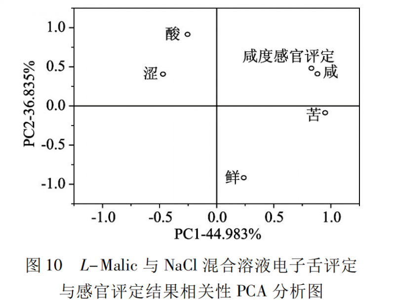 對L-Malic與 NaCl 混合溶液的感官咸度評分和電子舌所測得的咸、酸、苦、澀、鮮五組數據進行主成分分析( 如圖 10 所示) 。PC1 和 PC2 累積方差貢獻率為81.818%,“感官咸度評分”和電子舌數據“咸”在圖上位置相近,表明電子舌對溶液咸度的評分“咸”與感官咸度評分相關性較高。