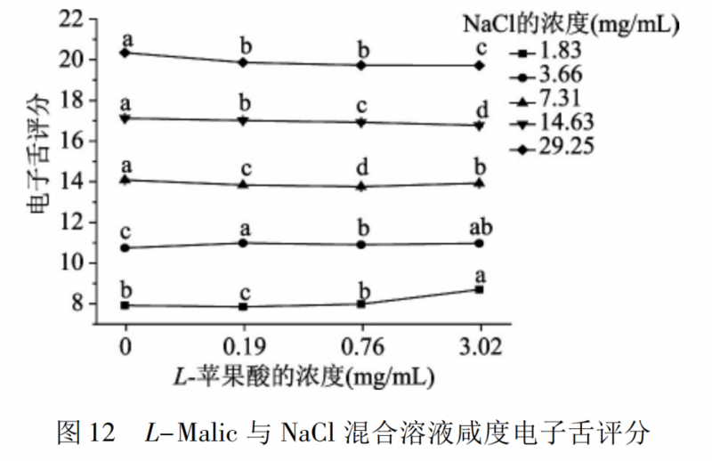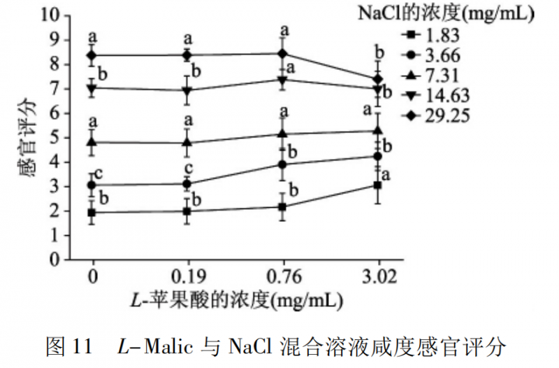 圖 11 是 L-Malic 與 NaCl 混合溶液咸度的感官評定結果。在 1.83、3.66 mg /mL 的氯化鈉濃度下,添加 0.76、3.02 mg /mL L-蘋果酸的混合溶液的咸度顯著高于氯化鈉溶液(p < 0.05) ; 在 29.25 mg /mL 氯化鈉濃度下,添加 3.02mg /mL L-蘋果酸的混合溶液的咸度顯著低于氯化鈉溶液(p < 0.05) 。圖 12 是電子舌對溶液咸度的評定結果。在 1.83,3.66 mg /mL 的氯化鈉濃度下,混合溶液的咸度顯著高于氯化鈉溶液( p <0.05) ; 而在其他氯化鈉濃度下,混合溶液的咸度顯著低于氯化鈉溶液( p < 0.05) ,其中在 7.31 mg /mL的氯化鈉濃度下,添加 3.02 mg /mL L-蘋果酸的混合溶液的咸度顯著高于其他兩組混合溶液,但仍顯著低于氯化鈉溶液( p < 0.05) 。將 L-蘋果酸與氯化鈉混合溶液咸度的感官評定結果和電子舌評定結果進行相關性分析,發現其相 關 性 系 數 r = 0.984 ( p <0.01) 。