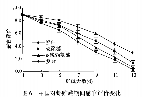 如圖 6所示,中國對蝦的感官品質在貯藏期間總體呈現下降趨勢,其中無處理的空白組下降的最明顯,在第 9d感官評分為 3,認定為完全腐敗。殼聚糖涂膜組在第 11 d徹底腐敗,經過殼聚糖涂膜處理的中國對蝦表面有一層保護膜,可以阻礙氧化反應的發生,抑制蛋白質變化,增加貯藏時間。e一聚賴氨酸處理組同樣在第 9d達到不可接受值,說明此 種處理方法在一定程度上抑制微生物的生長。與單獨涂膜處理相比,復合涂膜的效果更有利于延長貯藏時間,在第 13d感官評價值才低于不可接受值,與空白組相比延長 4 d。