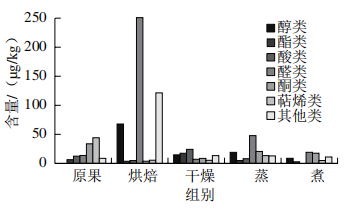 圖1表明,干燥后的揮發性物質相對于原果都有一定幅度的減少,例如醇類、酯類、酸類、萜烯類減少是由于干燥后烯烴類遭到破壞,同時可以看到沙棗中的醛類物質較多,尤其是在烘焙處理中含量最多,醛對棗果實的風味有顯著影響。