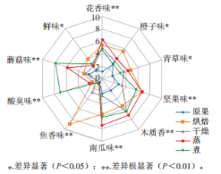 10種描述詞被選取用于5種處理后沙棗的感官評價:花香、橙子味、青草味、堅果味、木質香、南瓜味、焦香味、酸臭味、蘑菇味、鮮味,根據描述繪制風味輪廓圖,結果如圖3所示。不同方式預處理后的沙棗在所有感官屬性上的香氣強度均存在顯著差異(0.01<P<0.05),其中花香味、堅果味、木質香、南瓜味、焦香味、酸臭味和蘑菇味這幾種感官屬性存在極顯著差異(P<0.01)。