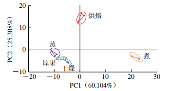 主成分分析(PCA)不僅能降低原始數據的維度還可以保留分開樣本的可變性。由圖5可知,PC1、PC2的貢獻率分別為60.1%和25.3%,累計方差貢獻率為85.4%(>85%),表明其可以有效反映原始數據的整體信息。烘焙和煮處理后的沙棗樣品位于PC1的負半軸,表明這烘焙、煮2類處理方式在PC1上差異明顯。原果、蒸、干燥處理后沙棗樣品在正半軸PC2上,烘焙和其他處理的沙棗樣品得到了較好的分離,其他4種處理方式位置區域接近,結果表明這4種預處理方式相互之間或許具有一些的相似之處。各樣品組別相互離散、無交叉,說明PCA能夠將不同方式預處理后的沙棗有效的區分開。因此,可以得出各個樣品組之間可通過電子鼻區分開并相互獨立,不同處理方式可以在不同程度上改變其沙棗的香氣成分。