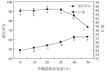 圖2杏鮑菇粉添加量對杏鮑菇魚松感官評分和b*值的影響