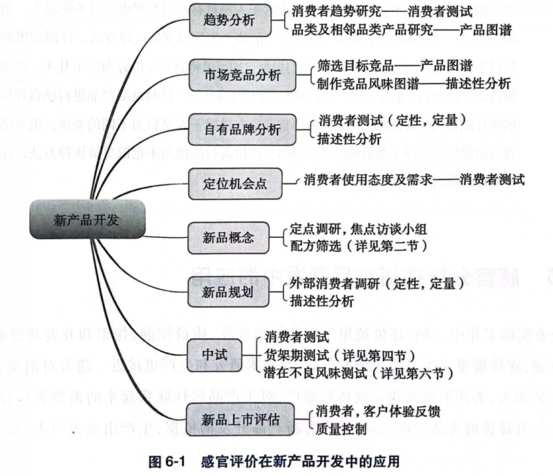 完整的新品開發(fā)流程具有很多環(huán)節(jié),其中包含產(chǎn)品趨勢分析,自有品牌分析,新品概念的生成,產(chǎn)品線規(guī)劃,中試以及新品上市放行等。因此,在新品開發(fā)中感官評價(jià)的方法是綜合性的,即多個(gè)感官測試貫穿于整個(gè)新品開發(fā)流程中。常見方法分布見圖6-1。