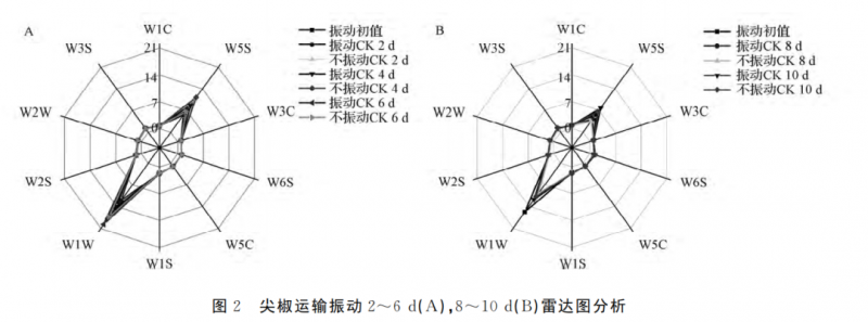 由圖6青圓椒的振動PCA 所示,青圓椒振動CK 組和不振 動 CK 組(A 組)在貯藏時間內,氣味變化并不明顯,以青圓椒貯藏2d和10d為例,做青圓椒的 振動雷達圖,如圖6(A)和(B)所示。振動 CK 組和不振動 CK 組的雷達圖的外形相近,接近于初值,2號和7號傳感器的響應值均為最大。運輸振動后貯藏10d內對青圓椒的氣味影響并不大,不會影響青圓椒的商品價值。