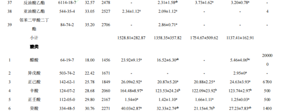 4個產地石榴酒中共檢測出8中酸類物質,共有物質5種。四個產地的石榴酒中含量最高的均為辛酸,其濃度較低時,呈令人愉悅的脂肪香和果香。