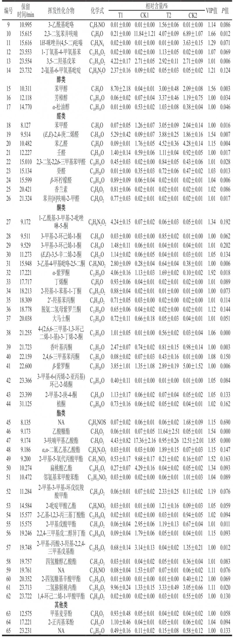 基于OAV的香氣特征分析如表4所示,當OAV>1時,定義為關鍵香氣成分,該香氣成分對總體香氣有直接影響;當0.1<OAV≤1時,定義為修飾性香氣成分,該香氣成分對總體香氣有輔助影響;當0<OAV≤0.1時,定義為潛在香氣成分,該香氣成分對總體香氣有潛在影響。在一定范圍內,OAV越大說明該香氣成分對總體風味貢獻越大。T1的關鍵香氣組分(OAV>1)為二氫獼猴桃內酯和壬醛,呈現甜桃香、木香、柑橘香、花香、焦糖香,CK2為二氫獼猴桃內酯,呈現甜桃香、木香,T2為二氫獼猴桃內酯、壬醛、苯甲醛和苯乙醛,呈現甜桃香、木香、柑橘香、花香、焦糖香、苦杏仁味、堅果香、玫瑰香、巧克力香。二氫獼猴桃內酯在T1、T2和CK2 3 種茶樣香氣中均占主導地位,其OAV以T1最高,為4.743,其次是T2為1.586。