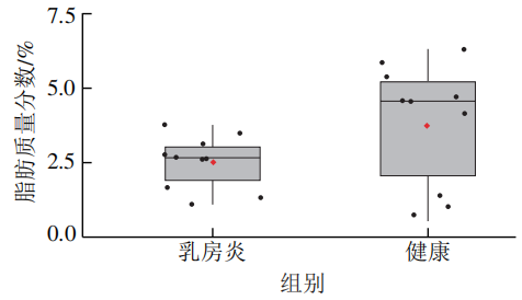 如表1和圖1所示,脂肪質量分數、密度、蛋白質量分數、冰點個指標P值均小于0.05,具有顯著差異,與健康組相比,乳房炎組牛乳脂肪質量分數顯著降低P0.05)。脂肪在體細胞數量較多的牛乳中顯著下降,可能是由于乳房發炎期間乳腺細胞合成和分泌能力下降。乳房炎牛乳中蛋白質含量增加,可能是由于奶牛患乳房炎后會增加乳房毛細血管的通透性,從而使蛋白含量增加。其余指標在兩種牛乳間差異不顯著(P0.05)。