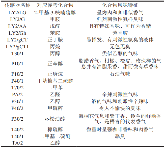 由圖2可知,電子鼻可以有效區分臨床乳房炎牛乳和健康牛乳樣品,PC1貢獻率達92.7%,可以很好地反映樣品的整體信息。電子鼻的18 個傳感器對兩種牛乳的風味化合物皆有響應,并且響應值各不相同。除LY2/LG傳感器響應強度差異不顯著,其余17 個傳感器對兩種牛乳的響應值均表現出顯著差異(P<0.05)。在健康牛乳中,T70/2、T40/2傳感器有顯著響應,對應香氣增加。在乳房炎牛乳中,P30/1、LY2/gCT、P40/2、LY2/G等傳感器具有顯著響應,對應的不愉快臭味增加。結合傳感器對應參考化合物的風味特征,由表2可知,奶牛患乳房炎后,其分泌的乳汁不新鮮,存在一定的刺激性氣味,加工價值降低。