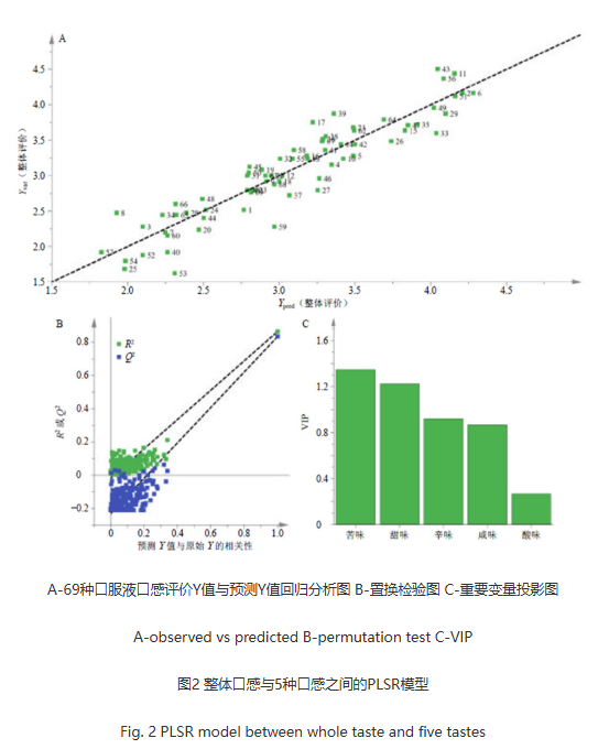 口服液整體口感預測模型:置換檢驗的R2回歸線的Y軸截距為−0.0176,Q2回歸線的Y軸截距為−0.3290,表明建立的模型沒有出現過度擬合,預測能力良好;圖2-C為口嘗結果PLSR模型獲取其變量重要性投影圖,通過該模型獲取其變量重要性投影(variableimportancefortheproject,VIP)值,VIP值是反映自變量對因變量的解釋能力的重要指標,VIP值越大說明自變量對因變量解釋能力越強,其中苦味和甜味VIP值>1,說明苦味和甜味是影響口服液整體口感的重要變量。