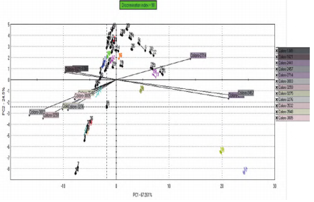 經過篩選重要顏色頻譜進行PCA分析,樣品間的區分指數為98,說明45批大米在色澤上存在著一定的差異,電子眼能夠區分開不同的大米樣品。第一主成分軸(PC1)占67.261%,第二主成分軸(PC2)占24.5%。說明主要差異集中在橫軸上,即在橫軸上距離越遠,差異越大。樣品17,18在右下角,游離在其他樣品之外,說明與其他樣本在色澤上的差異較大。樣品3和樣品7分布在相近的區域,樣品2、8、13、15、36、37、40處在相近區域,其他剩余樣本集中在相近區域。主成分分析能顯示出45個樣本間所有的差異。(如圖1所示)