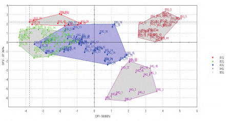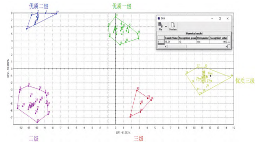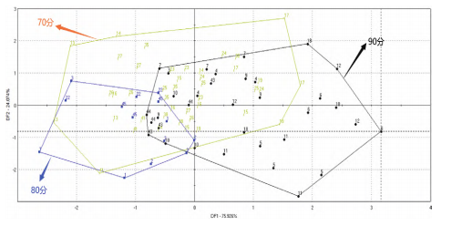 優質一二三級粳米對應的品嘗評分值為90/80/70,單獨選擇優質一二三級樣品,并運行DFA模型。模型圖(如圖8所示)中有部分區域重疊,說明優質粳米間的滋味區分不明顯。其次是國標中的品嘗評分值是結合了氣味/外觀結構/適口性/滋味/冷飯質地得到的綜合結果,數據的對應上有所偏差。